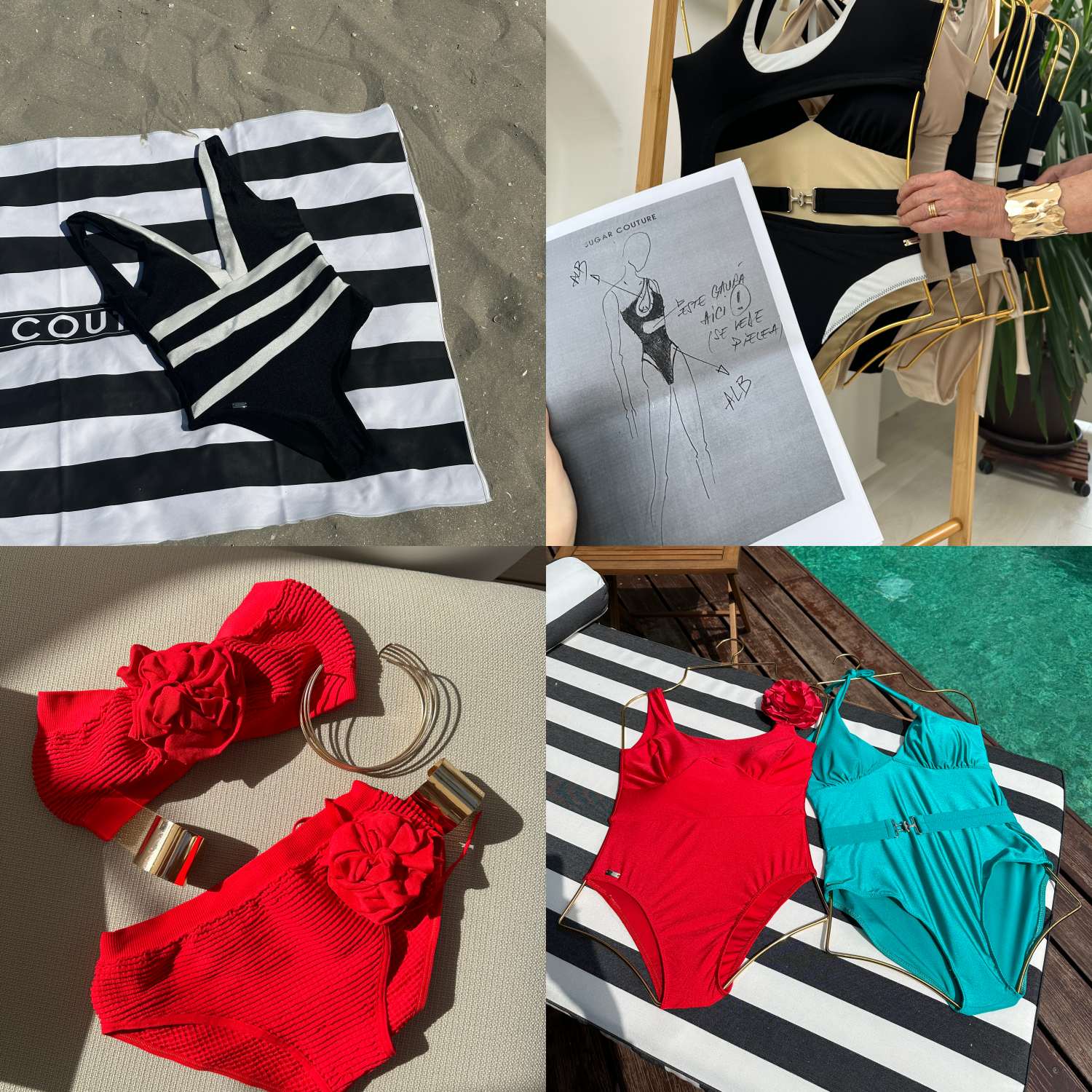 Fiecare costum de baie trece prin multe mâini, de la croitorie la călcat, de la etichetare la împachetare. În paralel, colaborăm cu fabrici partenere din România — afaceri de familie care există de generații întregi și care aduc cu ele o moștenire de migală, pasiune și demnitate. Lucrăm cu oameni care au crescut în jurul mașinilor de cusut, care își iubesc meseria și o duc mai departe cu respect.